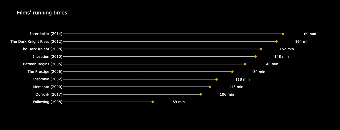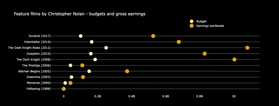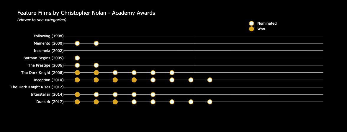 Nolan’s films have received 10 Academy Awards and more than thrice as many nominations. With the exception of Heath Ledger receiving an award for performance, most of the nominations and awards are in editting, music and cinematography (hover on the chart to see categories).